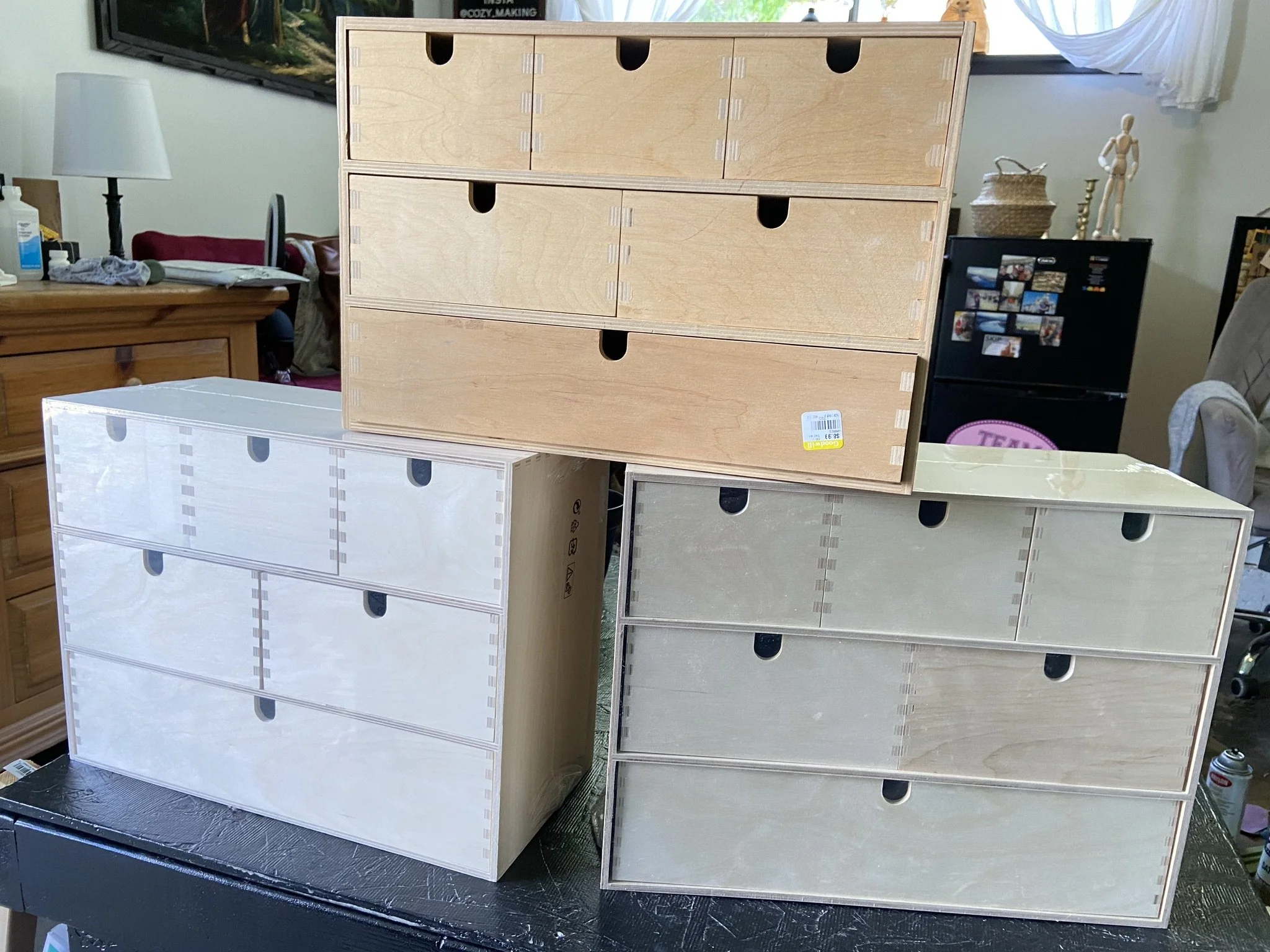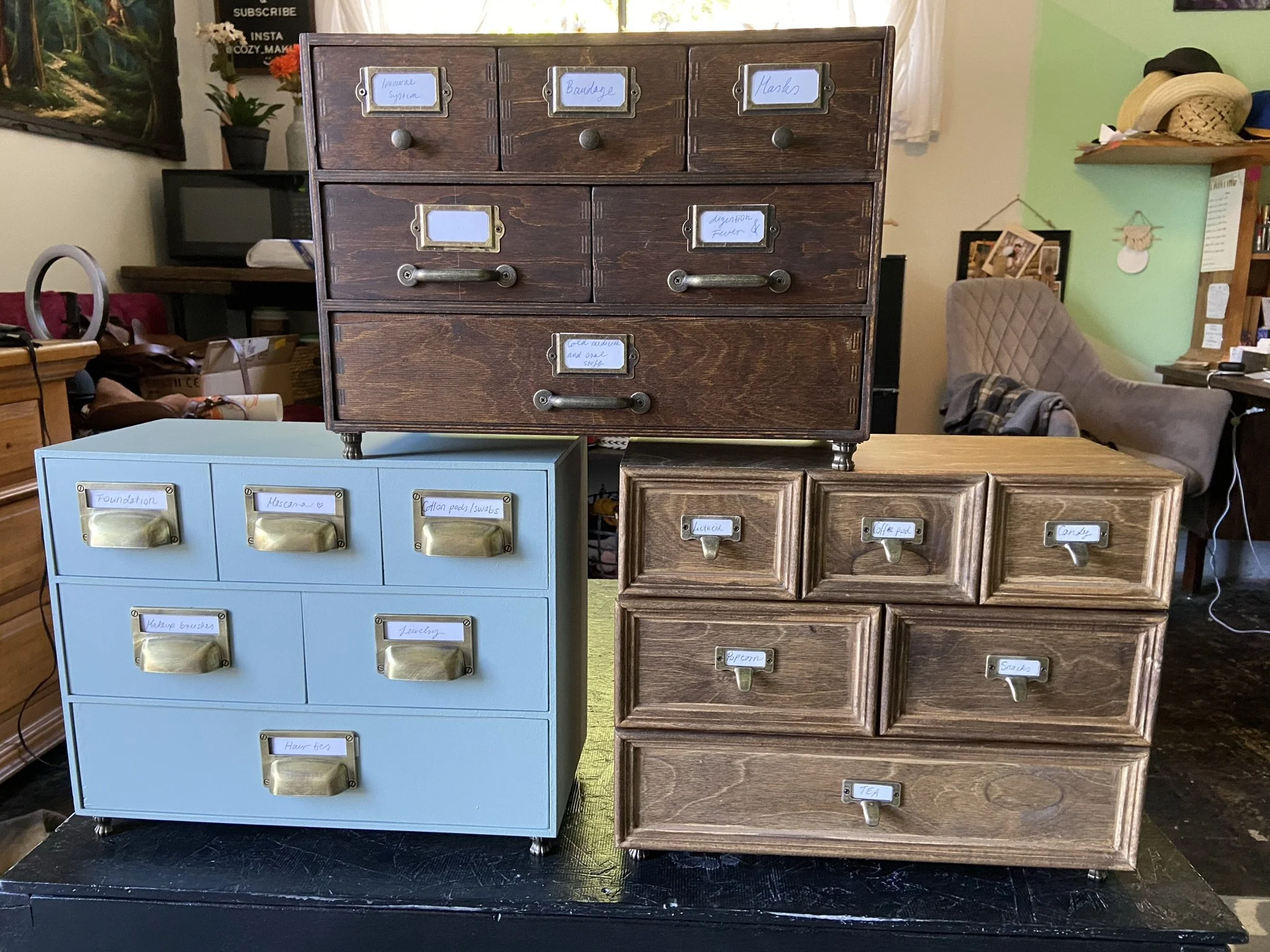 I love these little drawers from IKEA. I always wanted to make them look better. First I had to decide on the styles. I wanted all three to have a different vibe. I ordered three different kind of hardware and decided on different stains and paints. Then the work began.