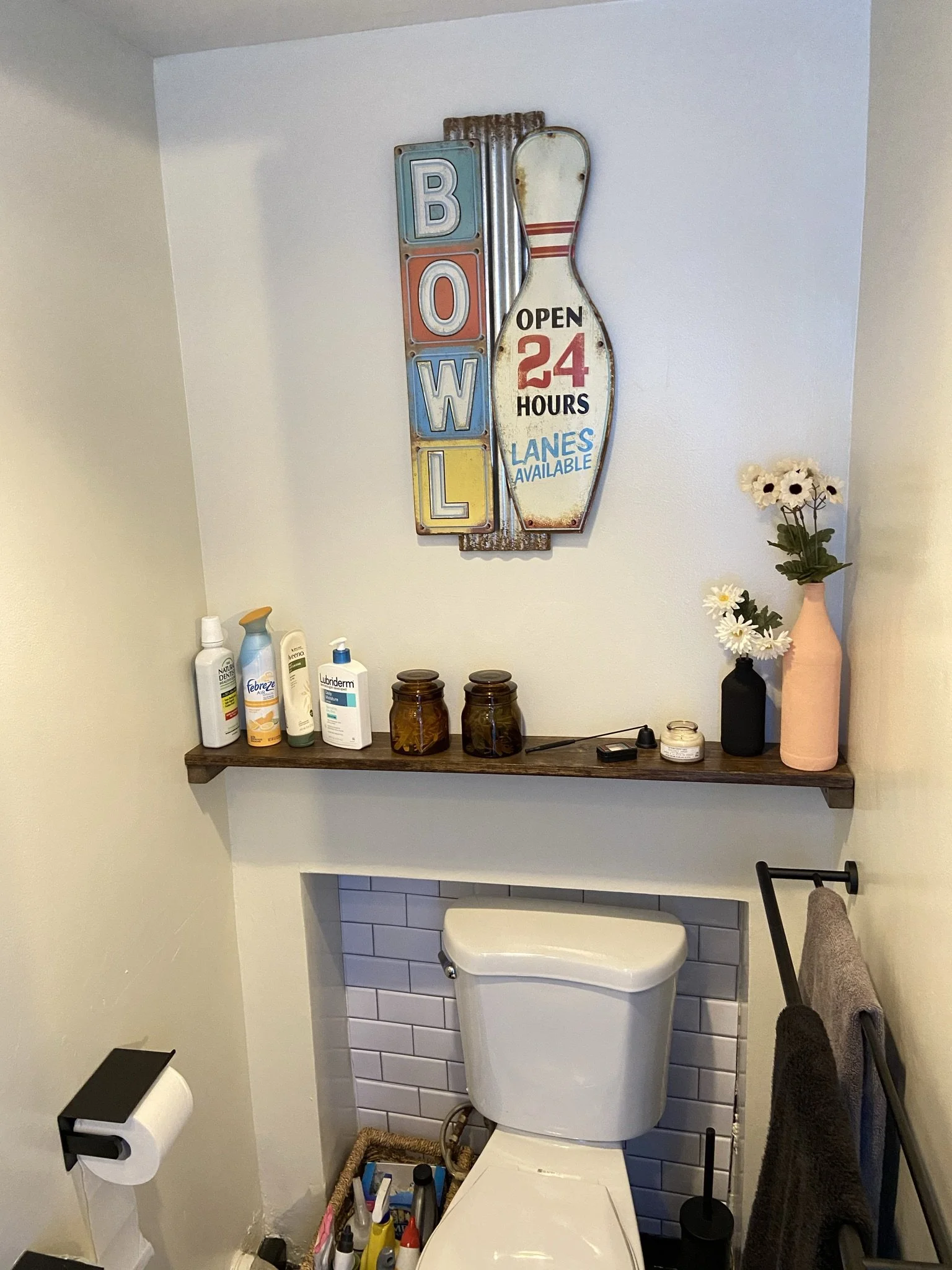 After the makeover It is clear that the lighter color walls were a good idea since there’s no window in there at all. I got rid of the metal shelf in the corner and went with a natural wood one that stretches across the back wall. I needed some natural element next to the wall color and the matt black accents.